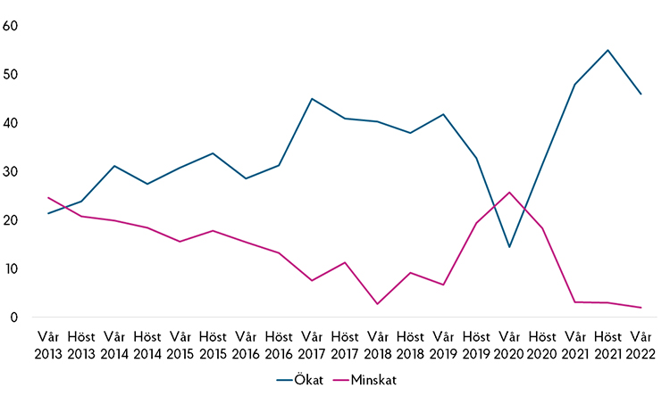 • Ökat: 46 procent (55 procent i höstens mätning)