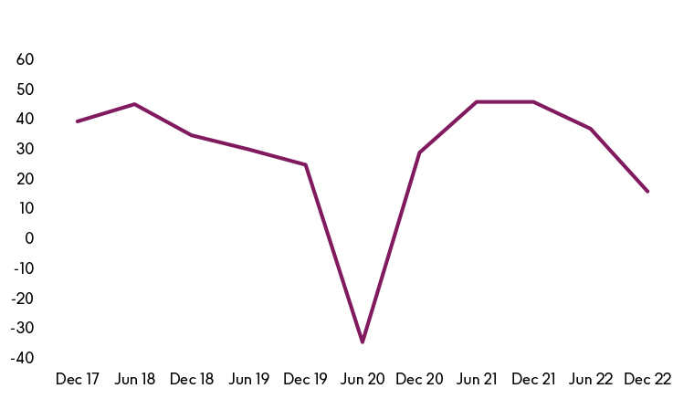 I indexet över företagens framtidstro vägs förväntningarna för det närmsta året gällande den finansiella situationen, orderingångar, likviditetssituation och antal anställda i Sverige, samman. Sedan mätningarna startade våren 2013 har indexet som lägst varit minus 35, vilket inträffade när pandemin slog till våren 2020, och som högst 46, under våren och hösten 2021.